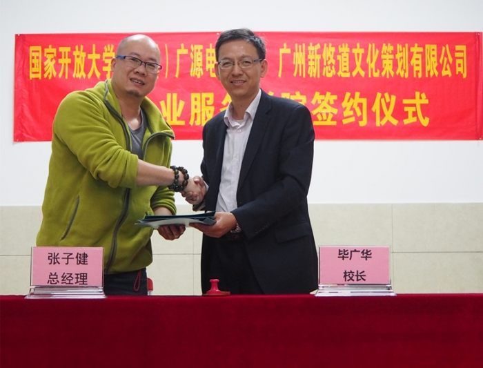 【本校讯】2月17日,我校与广州新悠道文化策划有限公司在花都校区举行了共建广源企业服务学院签约仪式。毕校长与张子健总经理完成了签约程序,标志着企业服务学院正式落地开始运营。