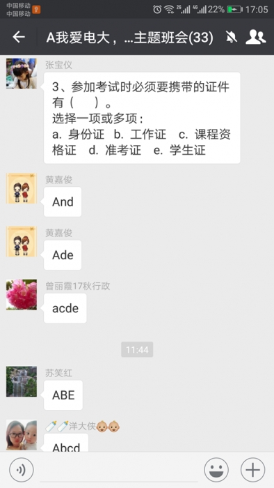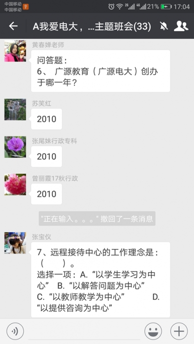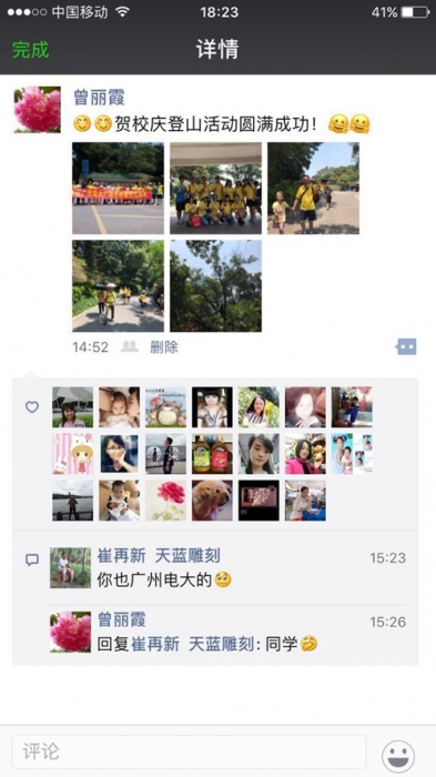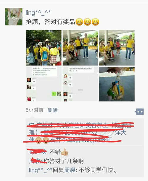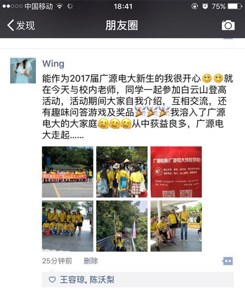 当天9时许,全校教工及参与本次活动的电大17秋新生代表集结在白云山脚下,由学生科长清点完人数,在毕校长的亲自带领下,大家向白云山的顶峰——摩星岭进发。一路上,大家一边登山,欣赏沿途美景;一边说说笑笑,畅谈教育。同学们你追我赶,老师们也毫不示弱。大家互相关心,互相扶持,互相鼓励,师生感情在登山途中酝酿得愈加浓厚。经过近一个小时的努力攀爬,大家经过了拍照最美景点——白云晚望,抵达了白云山至高点摩星岭。真正体会了一回:‘会当凌绝顶,一览众山小’的滋味。在摩星岭,师生们各自做了简短的自我介绍,就开始了本次主题班会课。班会课是用微信群发布有奖问答方式进行的,班主任提前把电大入学指南的题目和答案发到群里给同学们学习,然后再发布题目给同学们抢答。同学们积极思考,有的分工找答案、有的仔细思考判断选项,纷纷抢答,每个人都收获满满:不仅了解到了电大的学习要求和广源电大的建校历史,还拿到了丰富的礼品,还有微信红包,寓教于乐!