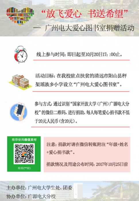 【本校讯】 近日,广州电大学生处发起智力扶贫献爱心,共建清远市阳山县秤架瑶族乡小学“广州电大爱心图书室”募捐图书款活动。我校师生热情响应,在一周时间内募集到3000元爱心图书款上交到广州电大团委。 (学生科 2017.10.23)